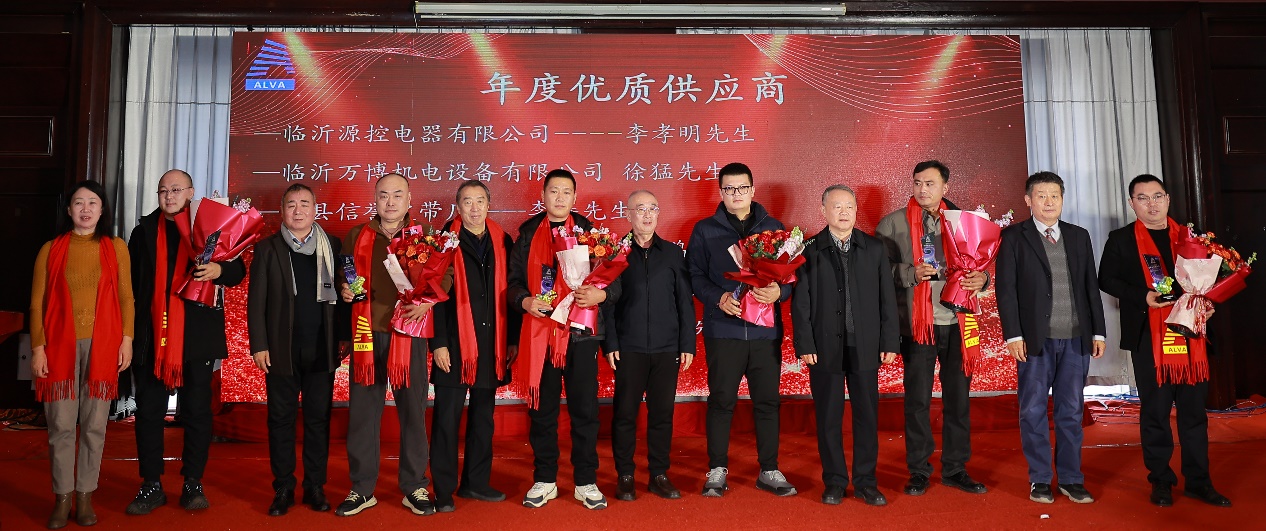 To honor excellence and set up role models, the annual celebration held a grand award ceremony, successively announcing the list of Annual High-Quality Suppliers and various company-level Annual Excellent Awards. The enterprises awarded as **Annual High-Quality Suppliers** include Linyi Yuankong Electric Appliance Co., Ltd., Linyi Wanbo Electromechanical Equipment Co., Ltd., Feixian Xinyu Belt Factory, Shanghai Walson Bearing Co., Ltd., Xuzhou Kailite Electromechanical Equipment Co., Ltd. and Linyi Gunuo Steel Co., Ltd., with their representatives Li Xiaoming, Xu Meng, Li Tao, Sun Peng, Wu Yuanpeng and Li Gongming taking the stage to receive the awards respectively.