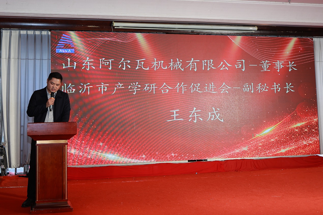 As the core highlight of the annual celebration, Wang Dongcheng, Chairman of Shandong Alva Machinery Co., Ltd. and Deputy Secretary-General of Linyi University-Industry-Research Cooperation Promotion Association, delivered an important speech. Chairman Wang first looked back on the outstanding accomplishments the company had attained in 2025, speaking highly of the concerted efforts of all departments, employees and partners. He then officially announced the company's **2026 business target of 100 million yuan**, and clarified the core development strategy for the new year: while continuing to expand and strengthen the two core business sectors of woodworking machinery and renewable resource equipment, the company will fully lay out the photovoltaic new energy industry chain, striving to open up a new journey of high-quality and diversified development and inject strong impetus into the sustainable growth of the enterprise.