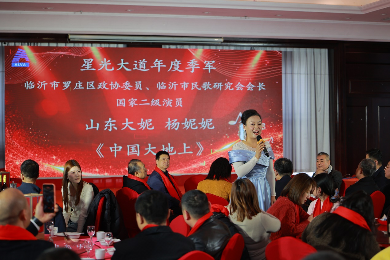 Após o discurso inspirador, a celebração anual deu início a uma esplêndida sessão de espetáculos culturais. Yang Nini, conhecido como 'Shandong Daini', vencedor do terceiro lugar da Avenida das Estrelas, membro do Comitê Distrital de Luozhuang da CCPPC de Linyi, presidente da Associação de Pesquisa da Canção Folclórica de Linyi e ator nacional de segunda classe, apresentou uma performance comovente de *Na Terra Chinesa*. Sua voz alta e clara e emoções sinceras levaram a atmosfera no local ao clímax. Mais tarde, Li Fangping, um famoso cantor tenor e ator nacional de segunda classe, cantou *As Mais Belas Canções para a Pátria* com uma voz melodiosa e comovente, acrescentando um forte toque festivo ao evento e deixando todos imersos no alegre clima de Ano Novo.